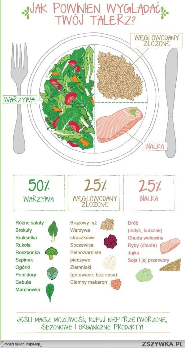 ✔ Porcji warzyw - powinna stanowić ok. 1/2 Twojego talerza - warzywa mogą występować w dowolnej formie: surówki, sałatki, gotowanej, grillowanej, pieczonej czy zupy krem. Zaleca się, aby przynajmniej raz dziennie w Twoim jadłospisie pojawiły się warzywa zielone, takie jak: szparagi, brokuły, jarmuż, sałaty czy brukselka.